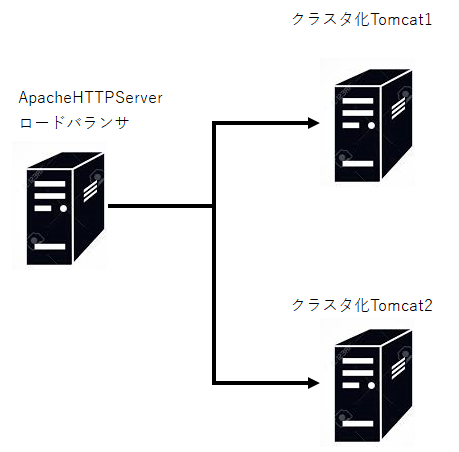 Apacheにロードバランサ設定を行い、2台のクラスタ化されたTomcatと連携する。