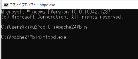 Apacheを起動する。起動方法はDos窓から起動する。(エラーの場合、Dos窓にエラーメッセージが出るから)